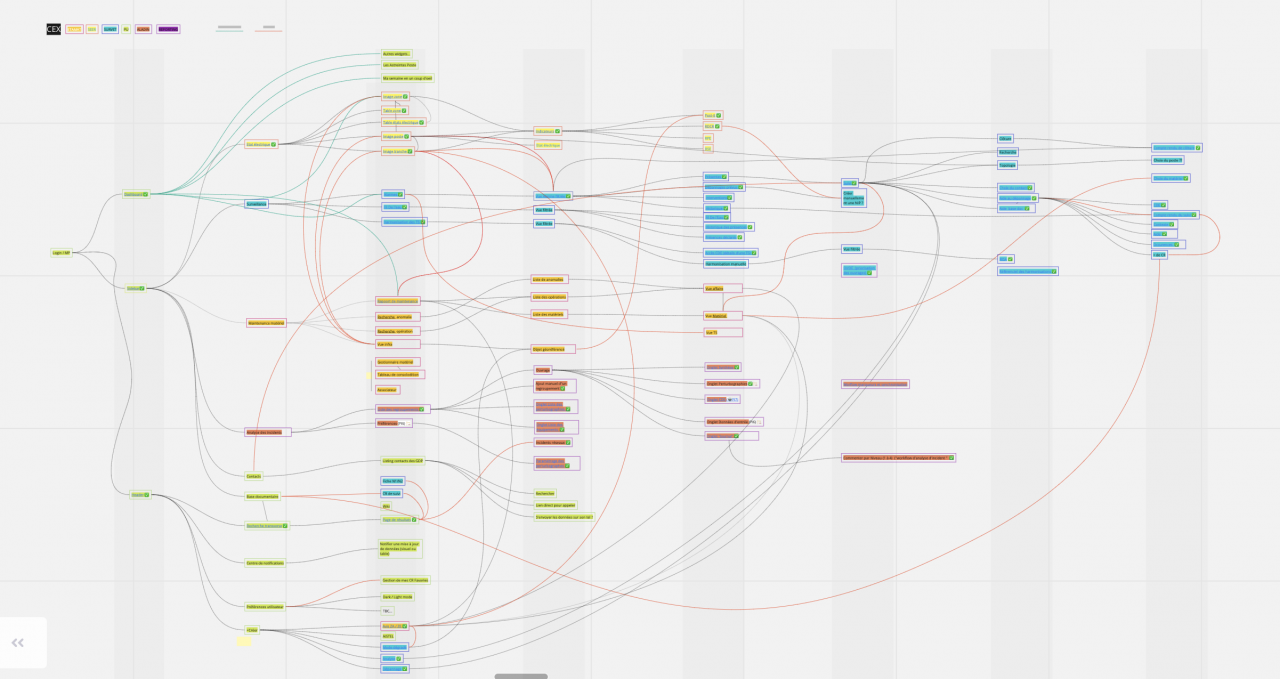 Le produit ayant une multitude de fonctionnalités, il m’a été nécessaire de construire (avec mon équipe) les différents parcours possibles ainsi que l’arborescence fonctionnelle de l’outil afin de conserver une vision d’ensemble.